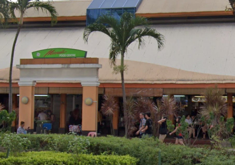 シンガポールで人気のホーカーズ(屋台街)の1つで、名物のチキンライスなどを食べることができます。4人が座っていた椅子やテーブルと同じものも多数並んでいますよ。